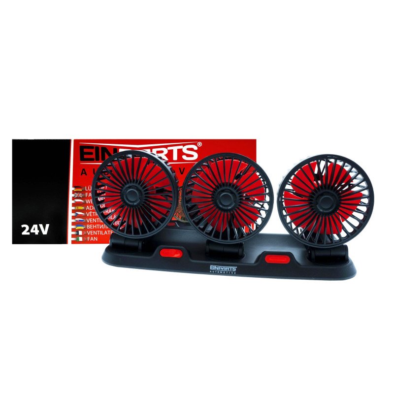 EPFAN02 is a functional triple 24V vehicle fan designed for vehicles with a 24V system, such as trucks and buses. It features three independently adjustable fan heads to improve airflow direction and circulation inside the vehicle.