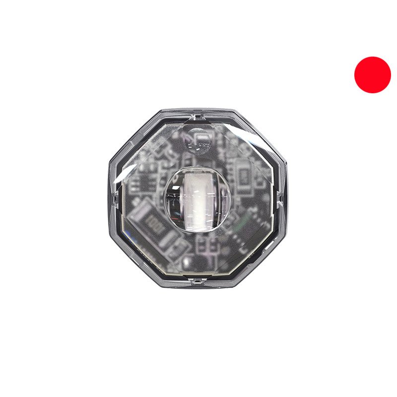Octa-Fit red beacon with one high power LED. Directional warning approved to ECE R65 Class 1 XR1. Suitable for side mirrors, tailgates, trunks, doors, and unmarked/undercover vehicles. Features OFF-override, self-contained flasher, sync up to 20 units, reverse polarity protection, 9 warning patterns, max 3.2W power.