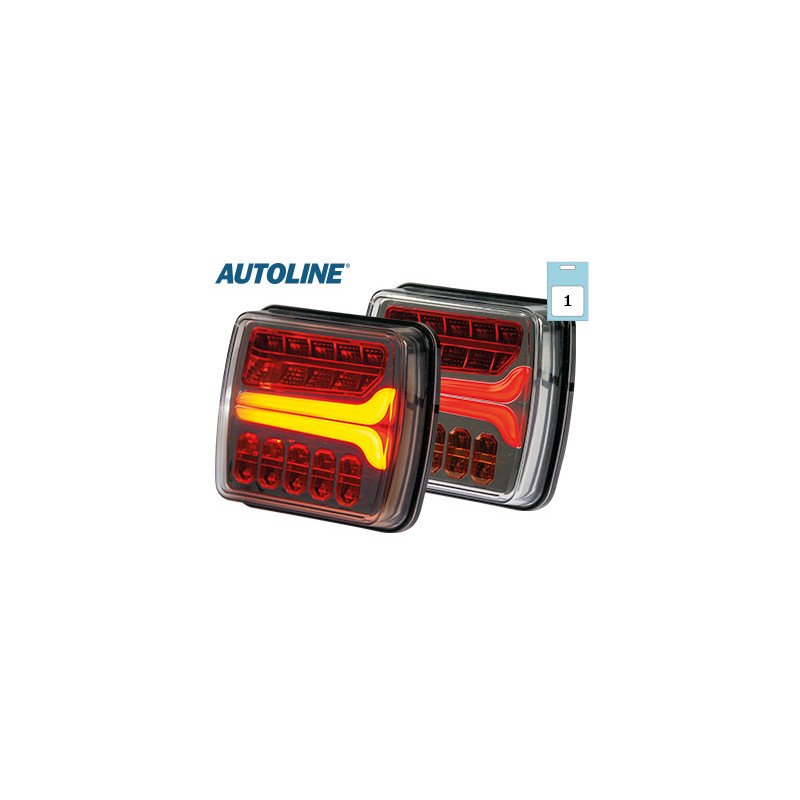 Right-side LED rear lamp with brake, position, side license plate light and dynamic turn signal (sequential). LED lights up with delay for running effect. IP67, -40 to +65°C. Not ECE-approved: for off-road or show use. Mounting: screws 55mm, 0.25m wiring. Wh=ground, Black=position, Red=brake, Yel=indicator.
