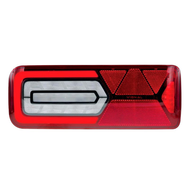 Left-side LED rear lamp Vignal LC12 for trailer. Dynamic indicator, stop, position, reverse, fog, triangular reflector. Horizontal mount, bolt distance 152mm. Connector: AMP 1.5 7-pin. ECE, ADR, EMC approved, IP69K. Road legal.
