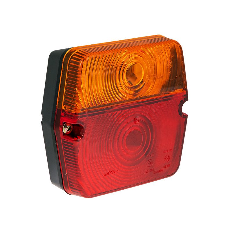 Rear combination lamp (brake, indicator, license plate) with black ABS base, polycarbonate and acrylic lens, ECE approved. Fixing: 2 x M6, 45mm. Bulbs not included: P21/5W (BAY15d) for stop/rear/license plate, R10W (BA15s) for indicator. ECE certified for road use.