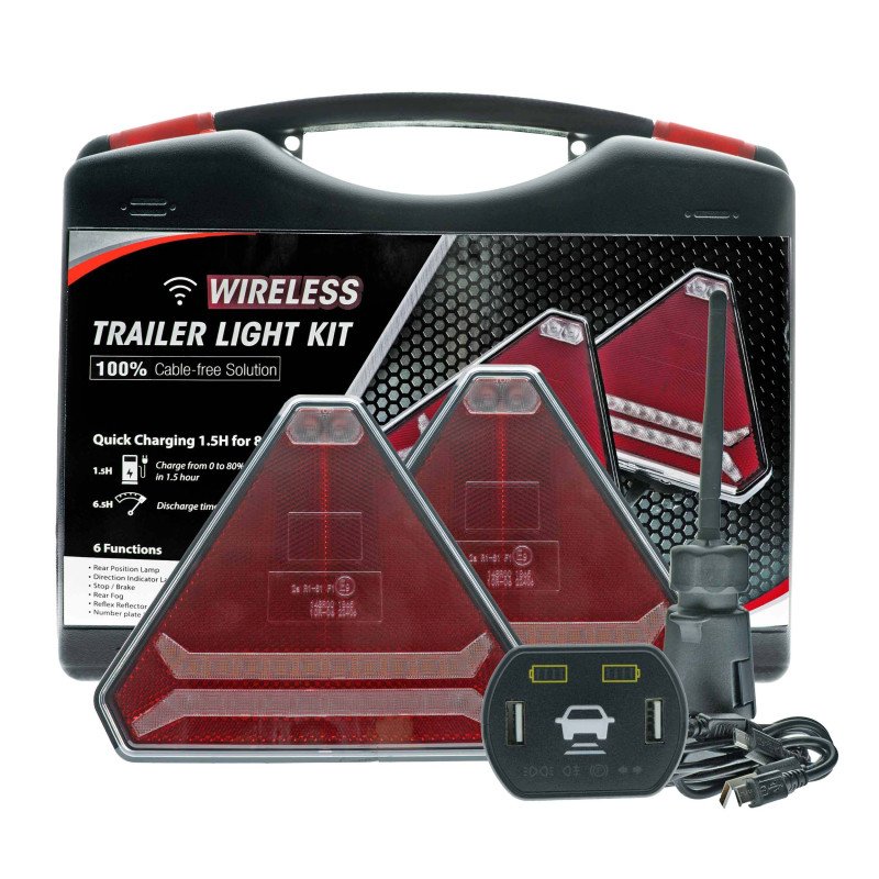 EPWLD51 is a modern wireless triangular rear LED light set for trailers, tow trucks, and semi-trailers. The magnetic mounting with a suction cup ensures quick and stable installation, while the transmitter connected to the vehicle's 7-pin socket transmits signals wirelessly via 2.4 GHz technology, eliminating the need for cables. The communication range is up to 40 m.