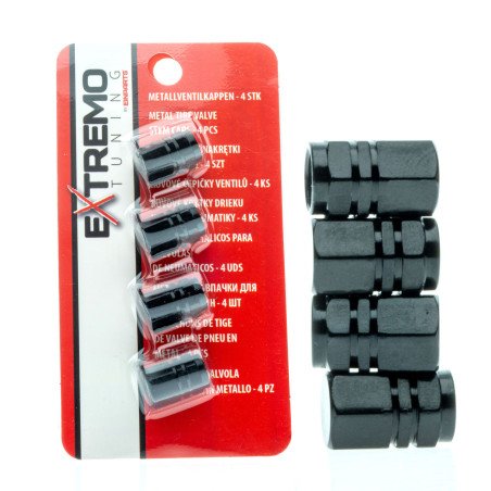 Aluminum Valve Caps - Black, Set of 4 Pieces Elegant valve caps made of high-quality anodized aluminum, ensuring durability and resistance to corrosion. The hexagonal shape makes them easy to install and remove while giving the vehicle a stylish appearance. They protect valves from dust, dirt, and moisture. Fits: Standard Schrader (AV) valves used in cars, motorcycles, scooters, and bicycles. (Not suitable for Dunlop or French Presta valves) Inside the caps, there is a gasket that additionally protects the valve from dirt and air loss. Technical Specifications: Height: 16mm Outer Diameter: 10mm Inner Diameter: 7mm Material: Aluminum Color: Black Quantity: 4 pieces