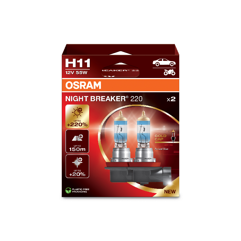 13-Parametrai: aprašymas:H11 55W 12V PGJ19-2, iki 220% didesnis ryškumas; NIGHT BREAKER 220 | 14-Mato vnt.: 2VNT | 16-Pakuotėje: 5