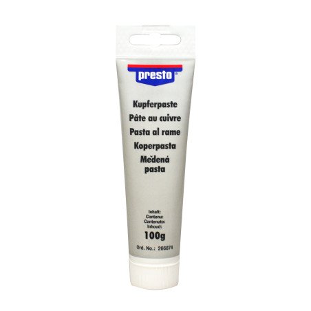 Presto Copper Paste is a soft, copper-coloured multiple-use paste for separative lubrication during high temperatures, high pressure-load and corrosive influences. Even after a long time of use and under extreme conditions the treated parts are easy to de-mount. Suitable for all kinds of screw connections, e.g. for lubrication during assembly of screw- and plug-connections, flanges and gaskets on tanks, engines, turbines, apparatus, armatures, disc brakes and exhaust systems, in chemical and petrochemical facilities, refineries, ceramic-, glass- and metallurgical plants, drying plants and drying stoves.