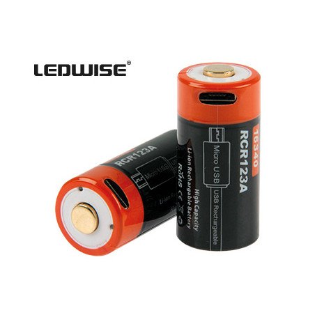 Komplektā 2 uzlādējamas CR123A baterijas, 3.7V, 700mAh, ar micro-USB uzlādes ligzdu. Iepakotas aizsargājošā kastītē. Nav paredzēts ceļu satiksmei.
