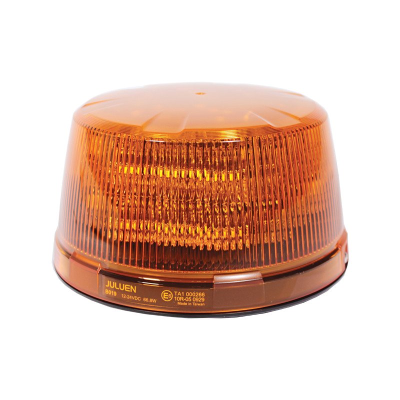 Heavy duty светодиодный маяк, янтарный, крепление на 3 болта (ø130/ø144мм), 24+12 светодиодов по периметру и вверх для 360°, алюминиевое основание, 14 режимов мигания, влагозащита IPX5, устойчив к вибрациям, ECE R65 (TA1, TB2), ECE R10, SAE J845 Class 1, CA13, -20°C…+65°C. Не для дорожного движения.