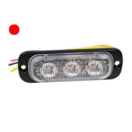 Красный накладной светодиодный маяк с прозрачной линзой, 3 мощных светодиода, 12 режимов мигания, энергозависимая память последнего режима, алюминиевое основание для отвода тепла, влагозащищенный и виброустойчивый. Можно синхронизировать с несколькими маячками. Максимальный ток 0,48А при 12В DC. Расстояние между крепежными отверстиями 77мм. IPX8. Одобрено ECE R65 класс 1 (XR1), ECE R10.