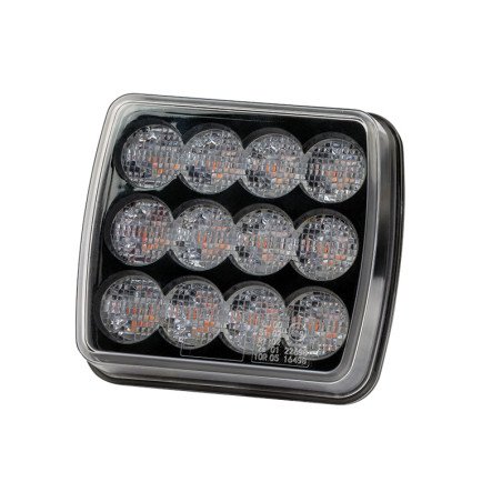 Светодиодный задний фонарь: функции указателя поворота, габарита и стопа. Крепление на болтах, рабочая температура -40°...+65°C. Класс защиты: IP67. ECE R148, R10 одобрено.